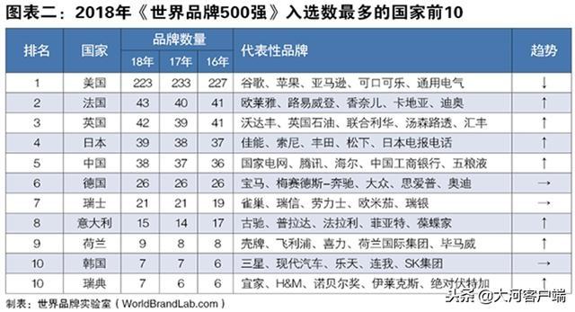 2018年《世界品牌500強》排行榜入選國家共計28個。從品牌數(shù)量的國家分布看,美國占據(jù)500強中的223席,繼續(xù)保持世界品牌第一強國位置;歐洲傳統(tǒng)強國法國和英國分別有43個和42個品牌上榜,分列二三位;日本、中國、德國、瑞士和意大利是品牌大國的第二陣營,分別有39個、38個、26個、21個和15個品牌入選。由此可見,即使歐洲經(jīng)濟低迷,但歐洲國家的超級品牌似乎依然堅挺。中國雖然有38個品牌入選,但相對于13億人口大國和世界第二大經(jīng)濟體,中國品牌顯然還處于“第三世界”。
