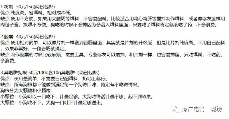 今天上午,記者通過搜索,找到了一名專門售賣異煙肼的網(wǎng)友,對方給出了粉劑、膠囊、異煙肼狗糧三種套餐,每種套餐中還特地標(biāo)明了針對寵物狗的配料優(yōu)缺點(diǎn),并且直接將寵物狗吃下后的效果也標(biāo)明在其中。
