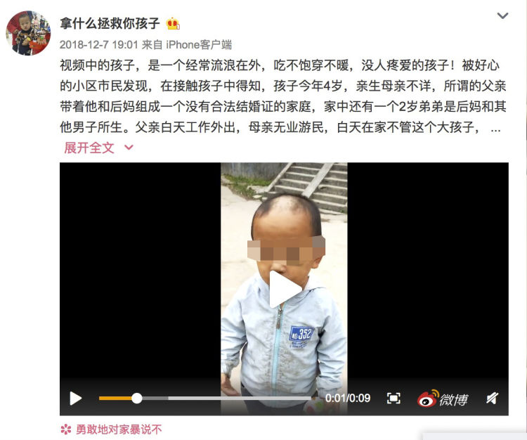 該微博網(wǎng)友敘述,小孩經(jīng)常在園山街道馬五村游蕩、席地而睡。好心人中告訴他,孩子今年4歲,親生母親不詳,所謂的父親帶著他和后媽組成一個(gè)沒有合法結(jié)婚證的家庭,家中還有一個(gè)2歲弟弟是后媽和其他男子所生,2歲弟弟也經(jīng)常獨(dú)自扔家中一天半天沒人看管。網(wǎng)友發(fā)布的一段視頻顯示,2歲的弟弟自己爬到了外面大馬路上“玩?!薄?/p>
