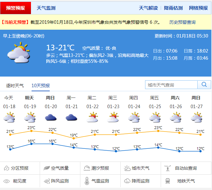 記者從深圳市氣象局了解到,今天多云,氣溫13-19℃;東北風2-3級,陣風5-7級;相對濕度60%-85% 。19-20日氣溫回升,天氣溫暖,早晚有輕霧,間中有零星小雨;21日受新一股冷空氣影響,陰天有小雨氣溫下降;展望22日起天氣晴朗干燥。