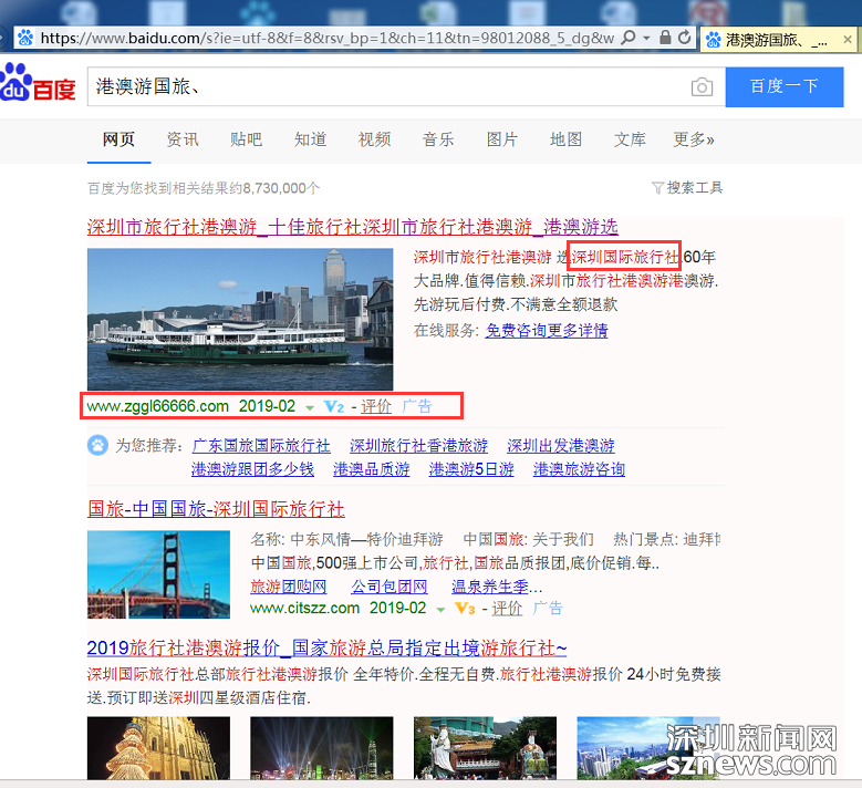 深圳市消委會模擬消費者網(wǎng)絡搜索實際使用場景,在百度搜索中搜索“港澳游國旅”等關鍵詞,進行了專項測試調(diào)查。調(diào)查發(fā)現(xiàn),搜素“港澳游國旅”等關鍵詞時搜索頁面會出現(xiàn)加V等級認證的旅行社廣告信息,但經(jīng)核實,“深圳信用網(wǎng)”商事主體登記信息中并無該企業(yè)。