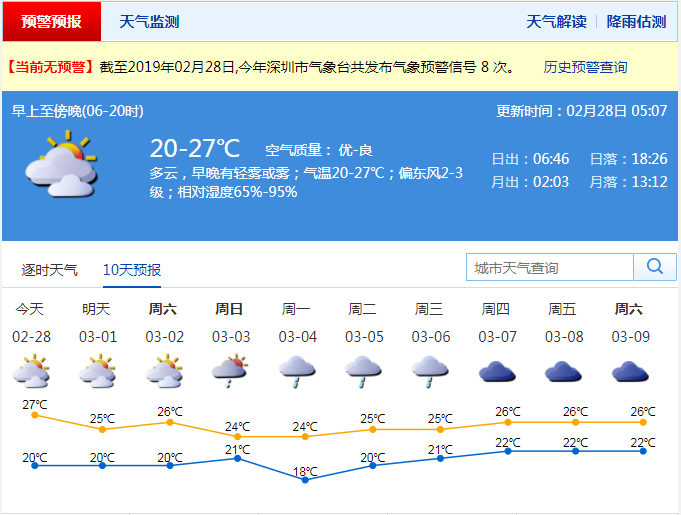 記者從深圳市氣象局了解到,28日深圳市以多云天氣為主,早晚有輕霧或霧;氣溫在20-27℃;東風(fēng)2-3級(jí);相對(duì)濕度65%-95%。