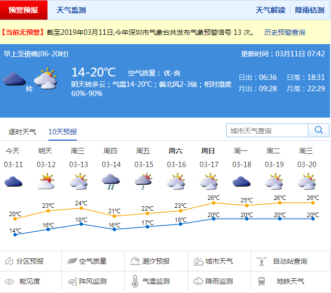 深圳新聞網(wǎng)2019年3月11日訊 自3月5日起,深圳已連續(xù)6日出現(xiàn)降雨,不少市民抱怨,再不出太陽(yáng),衣服都要發(fā)霉了。好在持續(xù)多日的降雨終于結(jié)束,“流浪”許久的太陽(yáng)要回歸了。記者從市氣象局了解到,周一(11日)陰天轉(zhuǎn)多云可見(jiàn)陽(yáng)光,周二周三(12-13日)多云間晴天,氣溫回升。