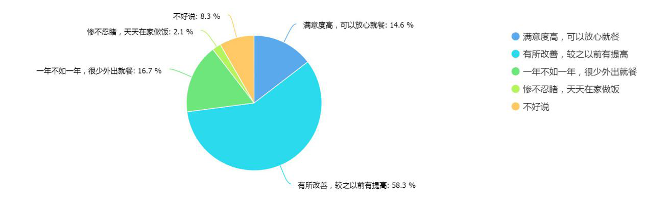 對(duì)于深圳白領(lǐng)非常關(guān)心的餐飲店面,接近6成受訪者認(rèn)為比之前有所改善,14.6%受訪者認(rèn)為可以放心就餐。