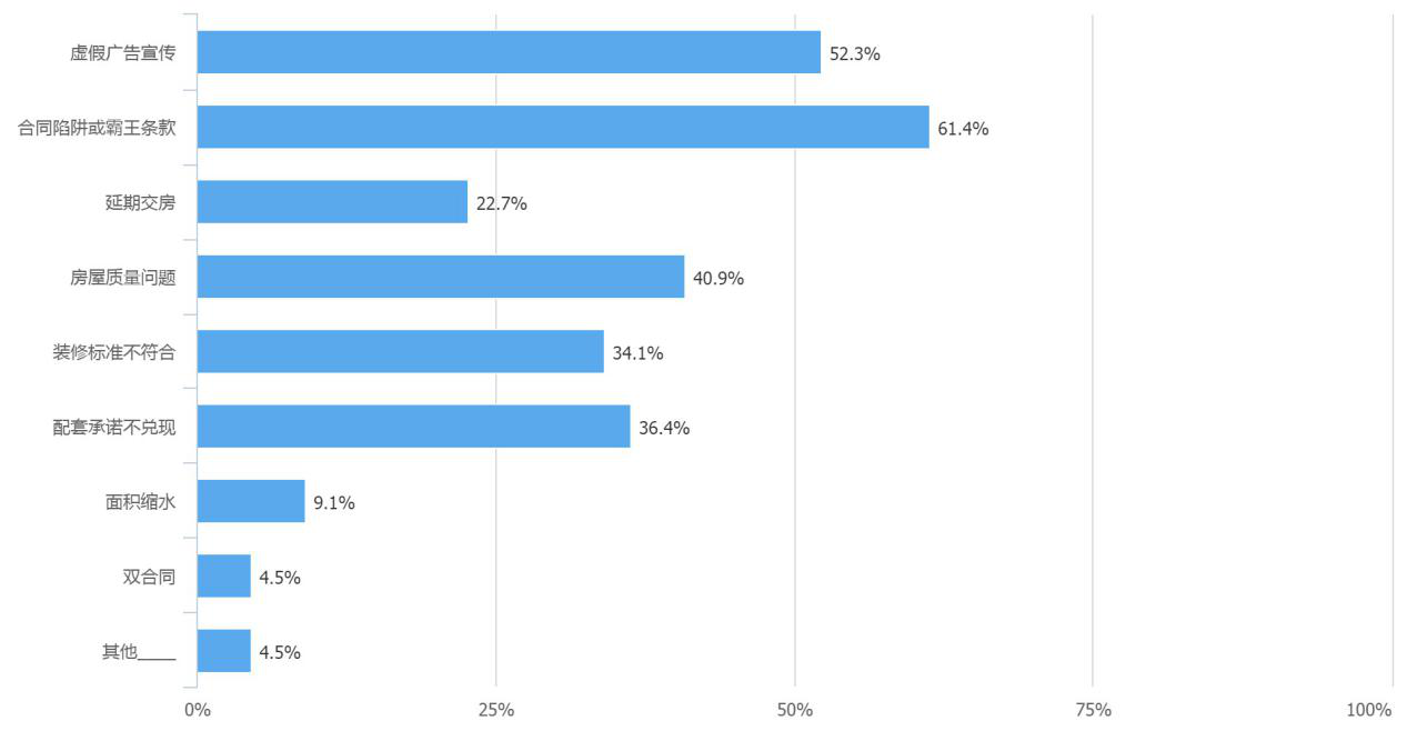 調(diào)查結(jié)果顯示,房產(chǎn)糾紛主要集中在購(gòu)買(mǎi)一手房、二手房和房屋裝修上,分別占比38.6%、27.3%、27.3%,而且將近70%的消費(fèi)者對(duì)房產(chǎn)交易過(guò)程中的相關(guān)知識(shí)和風(fēng)險(xiǎn)只是了解一般。同時(shí),消費(fèi)者在新建商品房和二手房交易過(guò)程中遇到的糾紛在問(wèn)卷結(jié)果中顯示都是多方面的。其中,新建商品房交易陷阱主要是“合同陷阱或霸王條款”、“虛假?gòu)V告宣傳”;二手房交易陷阱主要是“隱瞞房屋缺陷”。針對(duì)如何避免購(gòu)房糾紛,50%以上的消費(fèi)者認(rèn)為“購(gòu)房前咨詢朋友、專(zhuān)家”和“購(gòu)房前多學(xué)習(xí)房產(chǎn)知識(shí),防止受騙”是最好的辦法。