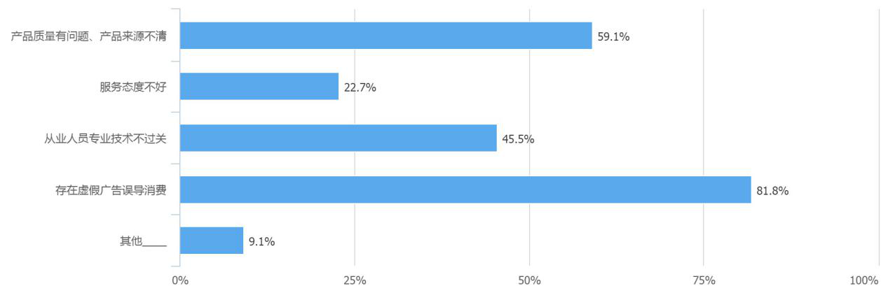 消費(fèi)者們認(rèn)為美容美發(fā)行業(yè)中存在最大的問(wèn)題是虛假?gòu)V告誤導(dǎo)消費(fèi),第二則是產(chǎn)品質(zhì)量問(wèn)題和產(chǎn)品來(lái)源不清。(常軍平/鄭媛/姚苑/田晨夕/曹園芳/田志強(qiáng)/潘寶儀)