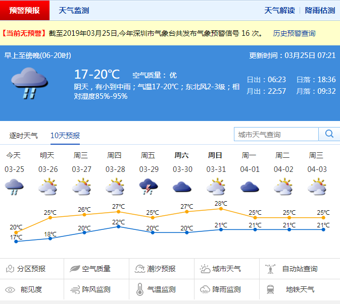 深圳新聞網(wǎng)2019年3月25日訊 今日仍陰涼有雨,降雨主要出現(xiàn)在凌晨至午后,有小雨到中雨,局部大雨,可能有零散雷暴。深圳市氣象局預(yù)計26日起轉(zhuǎn)多云可見陽光,氣溫逐日回升,27-28日暖濕有霧,最高氣溫可回升至25℃以上。