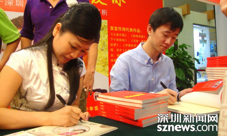 言言與《大美中國(guó)》的演唱者、歌唱家鄭海燕(圖左)為觀眾簽送唱片和詩(shī)集