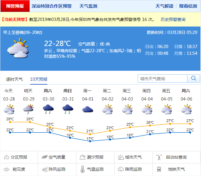 深圳新聞網(wǎng)2019年3月28日訊 深圳今日多云,早晚有輕霧或霧;20-27℃;南風(fēng)2-3級(jí);濕度60%-95%。預(yù)計(jì)29日多云轉(zhuǎn)陣雨;30-31日冷空氣影響,陰天有陣雨或雷陣雨,天氣轉(zhuǎn)涼;4月1日陰轉(zhuǎn)多云,偶有零星小雨;2日起氣溫逐日回升。