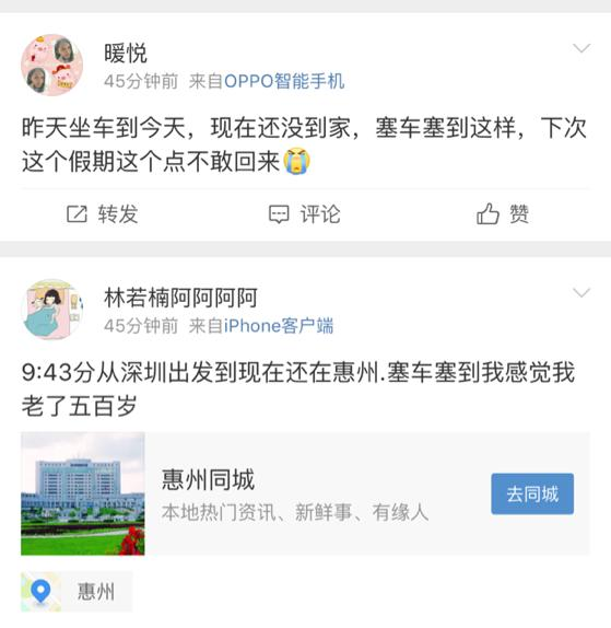有坐大巴的朋友因?yàn)槿嚂r(shí)間遠(yuǎn)超預(yù)期,遇上手機(jī)快沒電,心急不已,只能斷斷續(xù)續(xù)地開了又關(guān)機(jī),以便與接他的家人保持聯(lián)系又留住最后一點(diǎn)電量。而家人也在當(dāng)?shù)乜h城等了他四五個(gè)小時(shí)。