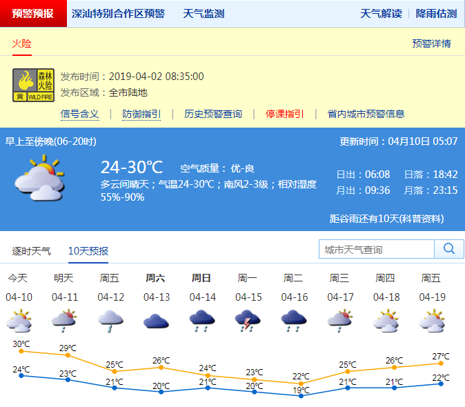 深圳新聞網(wǎng)2019年4月10日訊 超過30℃!深圳昨日氣溫創(chuàng)下2019年以來最高。記者從深圳市氣象局了解到,今日深圳市以多云間晴天天氣為主;氣溫在24-30℃;南風2-3級;相對濕度55%-90%。