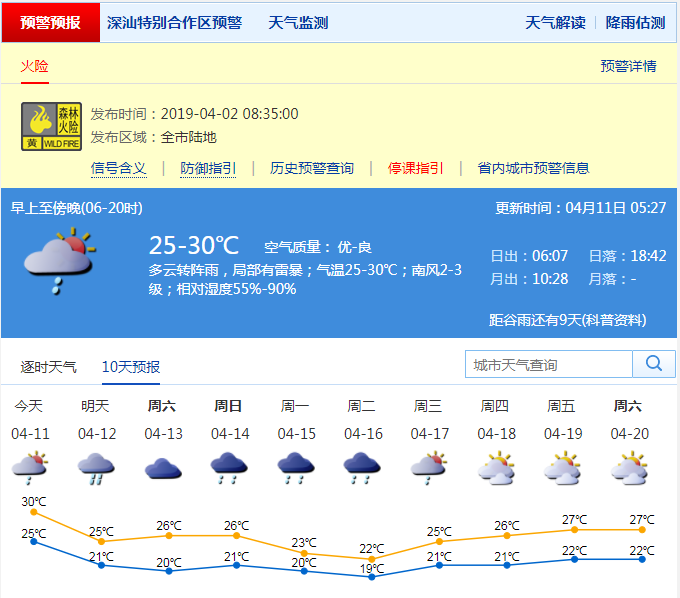 記者從深圳市氣象局了解到,11日深圳天氣多云轉(zhuǎn)陣雨;氣溫在25-30℃;南風2-3級;相對濕度55%-90%。