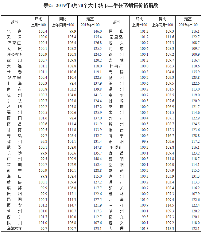 2019年3月份70個大中城市商品住宅銷售價格變動情況