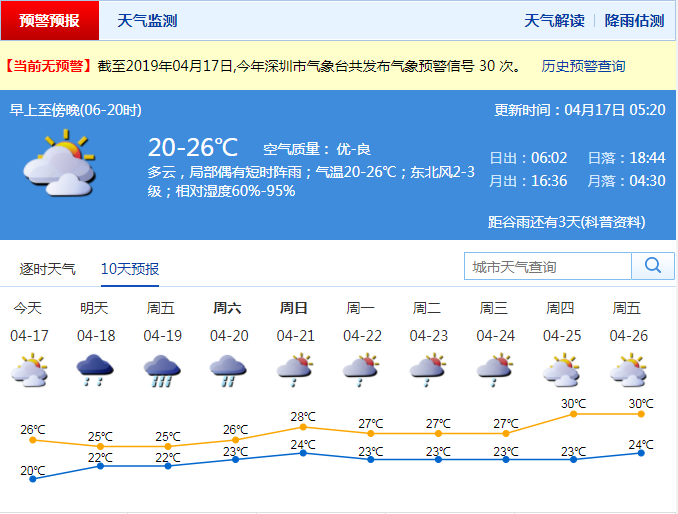 深圳新聞網2019年4月17日訊 連續(xù)6天的持續(xù)性降雨結束,今日深圳多云可見陽光,但"好景不長",記者從市氣象臺獲悉,18~20日又將迎來一輪暴雨局部大暴雨的降雨過程,21日降雨才會明顯減弱。
