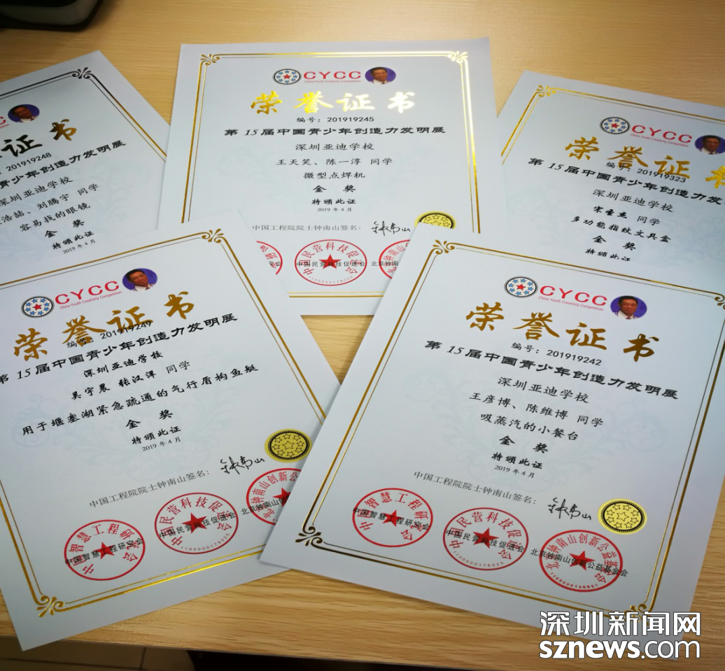 據(jù)了解,深圳亞迪學(xué)校有13名學(xué)子攜9個項目參賽,五個項目獲金獎,金獎證書9個,四個項目獲銀獎,銀獎證書8個,獲中國青少年創(chuàng)造力大賽鐘南山創(chuàng)新獎獎牌15塊,另有3人獲網(wǎng)絡(luò)人氣評選創(chuàng)造力先鋒獎,網(wǎng)絡(luò)人氣評選創(chuàng)造力新星獎,網(wǎng)絡(luò)人氣評選最佳創(chuàng)造力之星獎。