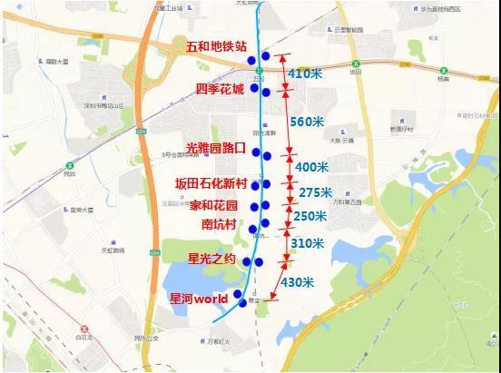 據(jù)介紹,五和大道是龍崗區(qū)坂田聯(lián)系市區(qū)的一條重要通道,道路交通流量及公交出行需求大,由于地鐵10號線施工導致道路條件受限,沿線五和地鐵站、四季花城、光雅園路口、南坑村和星河world等公交站大巴列車化問題突出,使得市民公交出行時間較長,同時也加劇了道路擁堵。而上述站點之間,鄰近兩個公交站的最大間隔為560米,最小間隔只有250米。