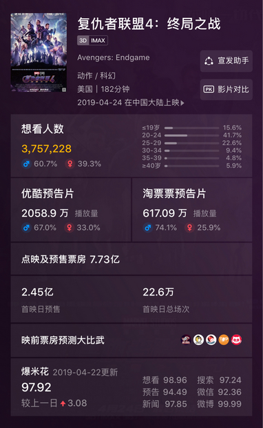 值得注意的是,淘票票×優(yōu)酷雙端合并平臺的“想看+預(yù)約”數(shù)超500萬,雙端預(yù)告片播放量破2600萬,打破進(jìn)口片想看+預(yù)約”紀(jì)錄,成為全網(wǎng)第一。淘票票打造的“漫威社區(qū)”突破450萬訪問,“想看人數(shù)”達(dá)到370萬(如圖),想看、評分和評論都是平臺沉淀下的重要數(shù)據(jù),它代表著用戶粘性和平臺依賴度。