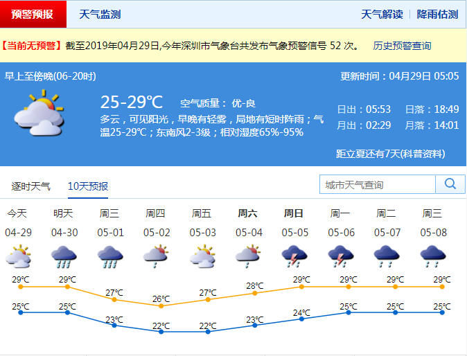 市氣象臺預(yù)測,“五一”假期其余時間(2-4日)多云為主,可見陽光,間中有短時陣雨,其中2-3日沿海和高地東風(fēng)強勁,最大陣風(fēng)8級左右。市氣象臺提醒市民,深圳已進入強對流天氣多發(fā)期,需留意最新預(yù)警預(yù)報信息,注意提前防范局地短時強降雨、雷雨大風(fēng)和冰雹造成的災(zāi)害,遠離戶外廣告牌、臨時建筑、低洼地和涵洞等排水不暢地區(qū)。