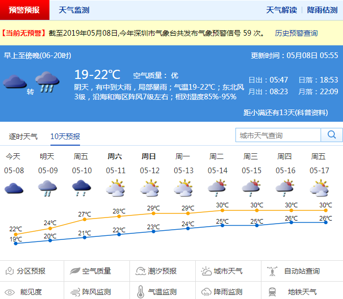 深圳新聞網(wǎng)2019年5月8日訊 6日夜間我市出現(xiàn)局部暴雨,伴有零散雷暴。全市平均雨量33.3毫米,全市最大雨量74.4毫米,出現(xiàn)在南山區(qū)大墈站,我臺(tái)先后在全市陸地和海區(qū)發(fā)布了雷電和暴雨黃色預(yù)警信號(hào)。受降雨影響,早晨最低氣溫19-20℃,白天最高氣溫僅僅22℃左右,不僅“入夏失敗”,不少市民還感覺“入秋”了。未來兩天仍舊體感陰涼。
