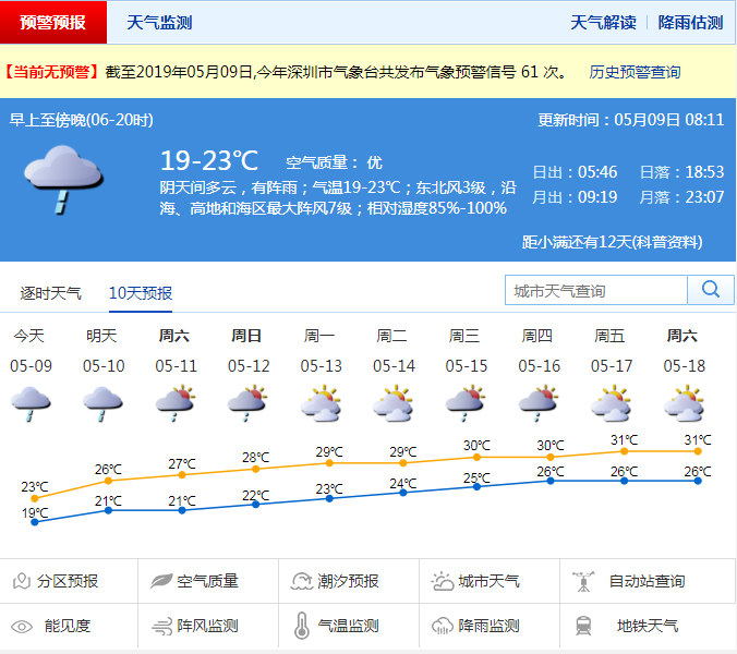 市氣象局預(yù)計,9日深圳以陰天天氣為主,有中到大雨,局部暴雨;氣溫在19-23℃;沿海、高地和海區(qū)最大陣風(fēng)6-7級。10-11日以多云天氣為主,有短時陣雨。12日起多云,氣溫明顯回升。