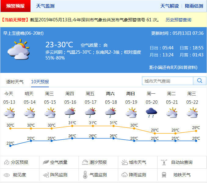 深圳新聞網(wǎng)2019年5月13日訊 深圳今日氣溫23-30℃,多云間陰天。市氣象臺預(yù)測,未來一周天氣持續(xù)炎熱,最高氣溫可達(dá)30-31 ℃。具體13-15日多云間晴天,早晚有輕霧,天氣炎熱,16-19日多云,部分時(shí)間有雷陣雨,中午前后天氣炎熱。