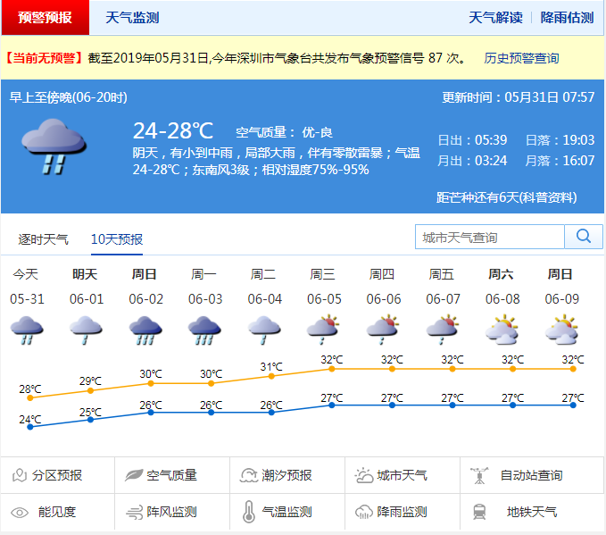 深圳新聞網(wǎng)2019年5月31日訊 記者從深圳市氣象局了解到目前我市仍處于龍舟水活躍期,31日至6月3日多局地暴雨。31日有中到大雨,局部暴雨;1日有陣雨,天氣轉(zhuǎn)趨悶熱,2-3日降雨再次加強,有大雨到暴雨,伴有雷暴;展望4-6日,仍多陣雨。