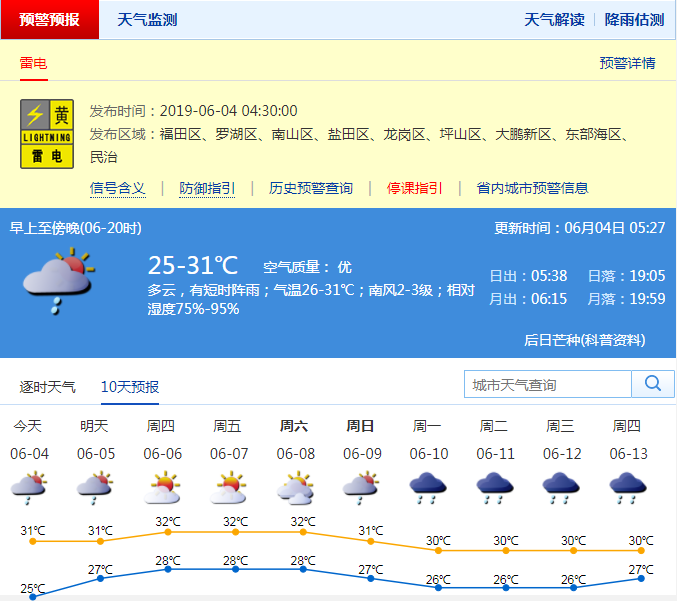 深圳新聞網(wǎng)2019年6月4日訊 近期深圳市(含深汕)頻繁強降雨過程4日起暫歇。6月4日氣溫25-31℃,多云,有短時陣雨;氣溫26-31℃;南風(fēng)2-3級;相對濕度75%-95%。