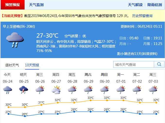 深圳新聞網(wǎng)2019年6月24日訊 今天白天,全市陰天有陣雨或雷陣雨,局地暴雨。最低氣溫27℃,最高氣溫31℃。本次降雨局地性明顯、短時雨較強、伴短時大風。