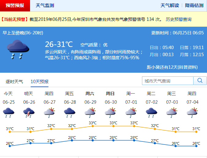 深圳新聞網(wǎng)2019年6月25日訊 昨日,深圳啟動(dòng)暴雨IV級應(yīng)急響應(yīng),全市普遍出現(xiàn)大雨,局部暴雨,最高氣溫26℃左右,高溫天氣緩解。市氣象臺(tái)預(yù)測,未來兩天風(fēng)力清勁,多陣雨,局部大雨。