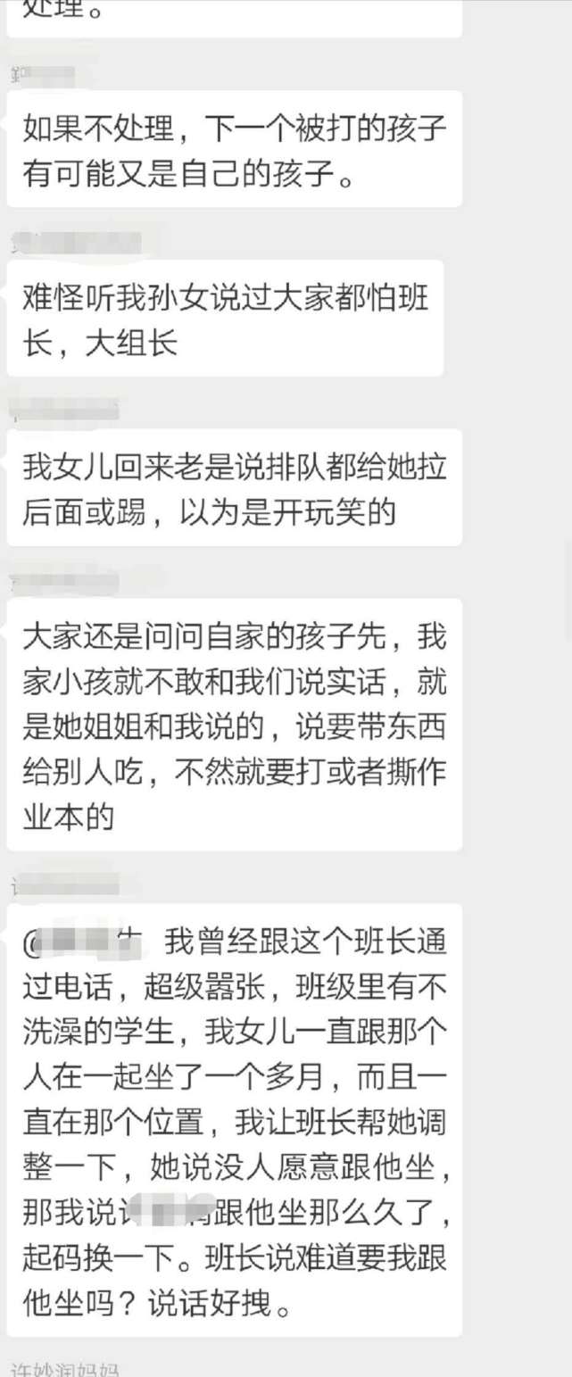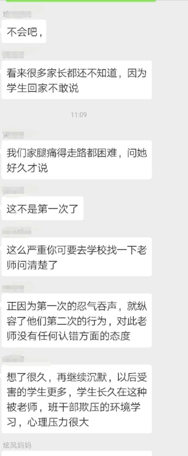 王先生把女兒的情況反映到家長群里,結(jié)果群里的家長紛紛表示,自己的孩子也反映當(dāng)天遭遇到班長的毆打,有的孩子甚至“腿疼得難以走路”。而據(jù)孩子反映,其實類似的毆打在班上已經(jīng)不止發(fā)生過一次。這名班長是女生,平時很受班主任的信任,經(jīng)常利用班干部的權(quán)力隨意懲罰學(xué)生?!八?jīng)多次要求班上同學(xué)給自己帶零食吃,不然就會被撕作業(yè)和毆打,還威脅不準(zhǔn)告訴家長?!蓖跸壬Q,家長們已經(jīng)將情況反映給班主任,但是班主任的反應(yīng)“相當(dāng)冷淡”,只是說會了解一下情況。25日下午,記者電話聯(lián)系到了王先生女兒的班主任,他表示已經(jīng)就此事對班長進(jìn)行了批評教育,但對于班長此前多次毆打同學(xué)的行為他表示并不知情,“當(dāng)初讓這名同學(xué)做班長是因為她成績好,而且守紀(jì)律。而且我覺得,孩子之間有些矛盾很正常?!卑嘀魅握f。(記者 李東明)