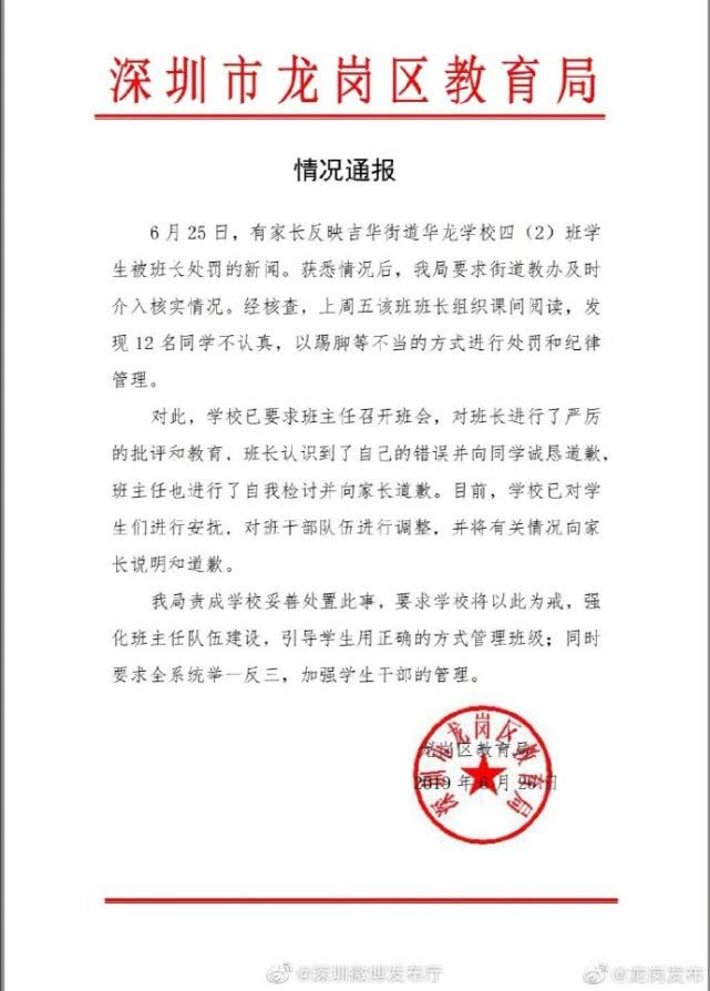 原標(biāo)題:30多名小學(xué)生排隊被班長“拳打腳踢”?龍崗區(qū)教育局通報來了