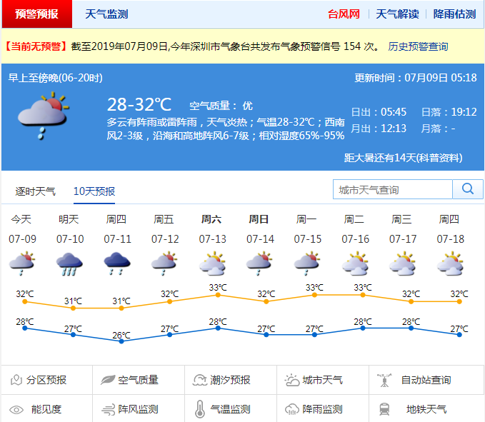 深圳新聞網(wǎng)2019年7月9日訊 近幾天,深圳天氣炎熱,有短時陣雨,白天最高氣溫達(dá)到31~33 ℃。預(yù)計9日有陣雨或雷陣雨,10~11日將有一次中到大雨局部暴雨過程,伴有雷暴和7~8級短時大風(fēng),炎熱天氣將有所緩解。