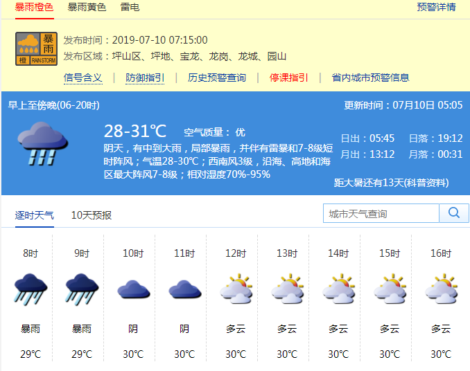 深圳新聞網(wǎng)2019年7月10日訊 7月10日早晨6時(shí)50分從深圳市氣象臺(tái)獲悉,過去1小時(shí),龍崗區(qū)(寶龍、龍崗、龍城、園山街道、坪地街道)和坪山區(qū)累計(jì)雨量已達(dá)暴雨,預(yù)計(jì)強(qiáng)降雨還將持續(xù)1小時(shí)左右,深圳市氣象臺(tái)于7月10日6時(shí)45分在龍崗區(qū)(寶龍、龍崗、龍城、園山街道)發(fā)布暴雨橙色分區(qū)預(yù)警,7時(shí)15分又在坪山區(qū)和龍崗區(qū)坪地街道發(fā)布暴雨橙色分區(qū)預(yù)警。全市進(jìn)入暴雨防御狀態(tài),請注意防御。全市中小學(xué)、幼兒園可視情況推遲上學(xué)。
