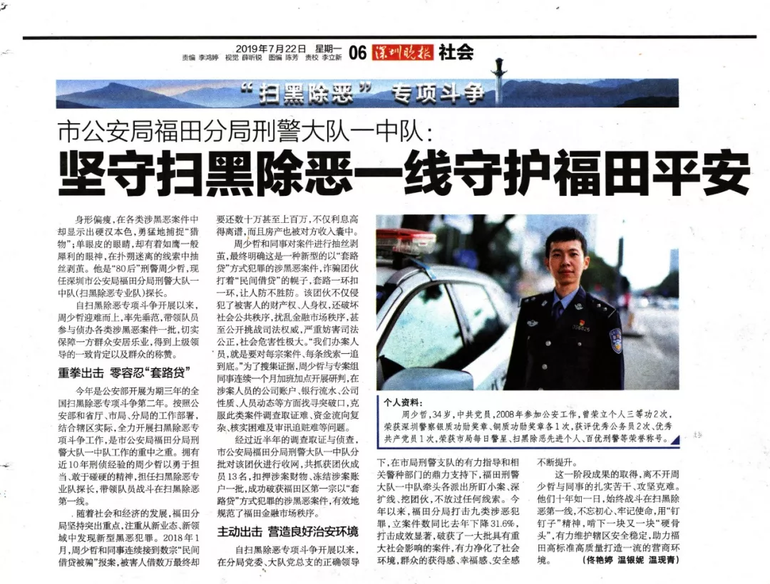 今年是公安部開展為期三年的全國掃黑除惡專項斗爭的第二年。按照公安部和省廳、市局、分局的工作部署,結(jié)合轄區(qū)實際,全力開展掃黑除惡專項斗爭工作,是市公安局福田分局刑警大隊一中隊工作的重中之重。擁有近10年刑偵經(jīng)驗的周少哲以勇于擔當、敢于碰硬的精神,擔任掃黑除惡專業(yè)隊探長,帶領(lǐng)隊員戰(zhàn)斗在掃黑除惡第一線。