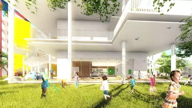 項目打破傳統(tǒng)整齊排列的布局方式,打造出4個與邊界呼應的靈活體塊,在保證幼兒園首層活動空間完整最大化的同時,將新舊校舍結(jié)合,打造一個聯(lián)通式共享庭院。新建校舍為每一個班級都提供了專屬的室內(nèi)外無邊界活動空間。除首層班級與室外活動空間直接連通以外,二、三層班級外設有錯落的活動露臺及挑檐,實現(xiàn)每層均可嬉戲、游樂、探索的布局。