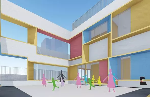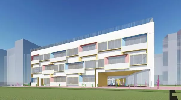 項(xiàng)目用地緊張且形狀不規(guī)則,與周邊建筑距離較近。在被3小時(shí)日照線及周邊建筑最近點(diǎn)的18米范圍線切割的用地上布置幼兒生活用房,同時(shí)保證主要的幼兒生活用房(即班級(jí)活動(dòng)單元)南向采光。在滿足功能需求的前提下,首層最大范圍的架空,并與室外活動(dòng)場(chǎng)地、綠地形成一體,南北連通,為幼兒提供開敞的室外活動(dòng)空間。
