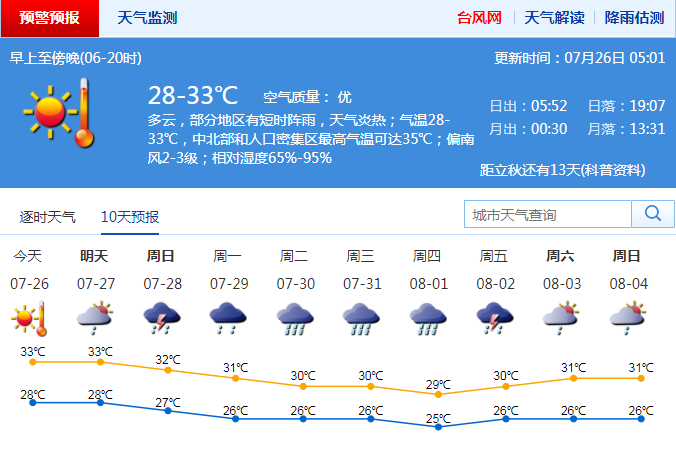 記者從市氣象臺(tái)獲悉,受副熱帶高壓影響,26日多云,局部有短時(shí)陣雨,氣溫28~33 ℃,局部最高35 ℃;27日多云,部分地區(qū)有短時(shí)陣雨或雷雨,天氣炎熱;28日有雷陣雨,伴有短時(shí)強(qiáng)降水和6~8級(jí)短時(shí)大風(fēng);29日有雷陣雨,局部大雨;30~31日有一次明顯降雨過程。