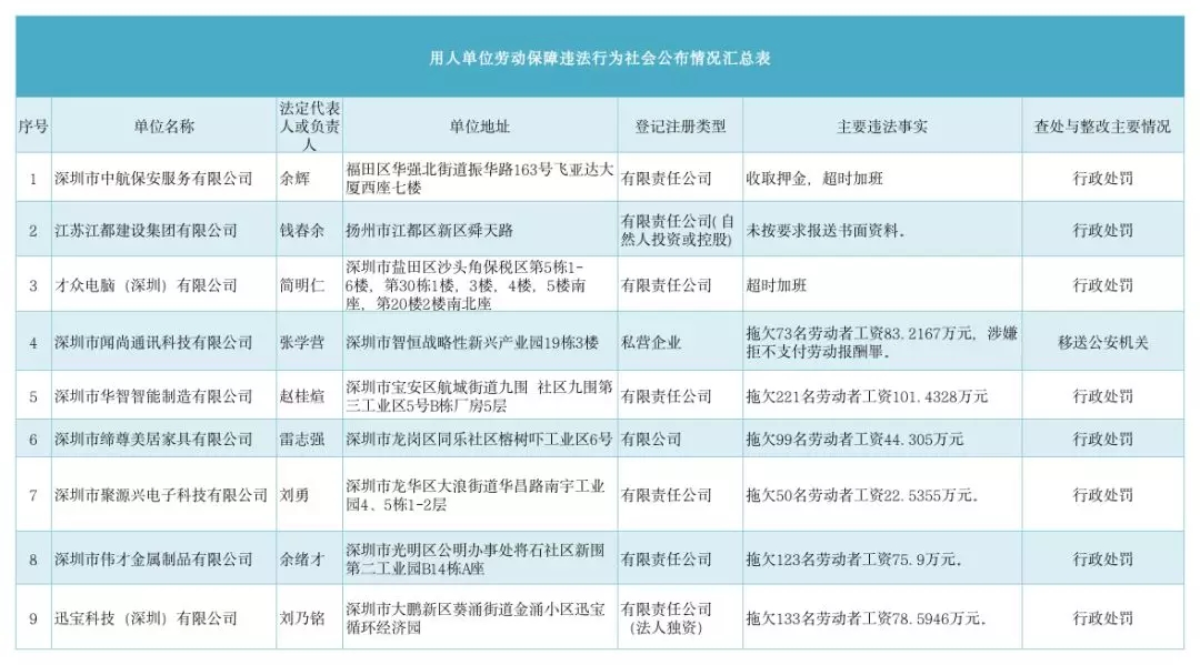 記者了解到,2019年第二季度深圳市人力資源部門繼續(xù)加大對欠薪等勞動保障違法行為的打擊力度,依法處罰,對涉嫌犯罪的堅(jiān)決移送司法機(jī)關(guān),切實(shí)維護(hù)勞動者的合法權(quán)益。為加強(qiáng)對違法用人單位的社會監(jiān)督,強(qiáng)化誠信體系建設(shè),加大威懾力,依據(jù)《廣東省用人單位重大勞動保障違法行為社會公布暫行規(guī)定》和《深圳市勞動保障違法信息公布辦法》,現(xiàn)將部分區(qū)(新區(qū))人力資源部門查處的一批勞動保障違法案件予以公布。