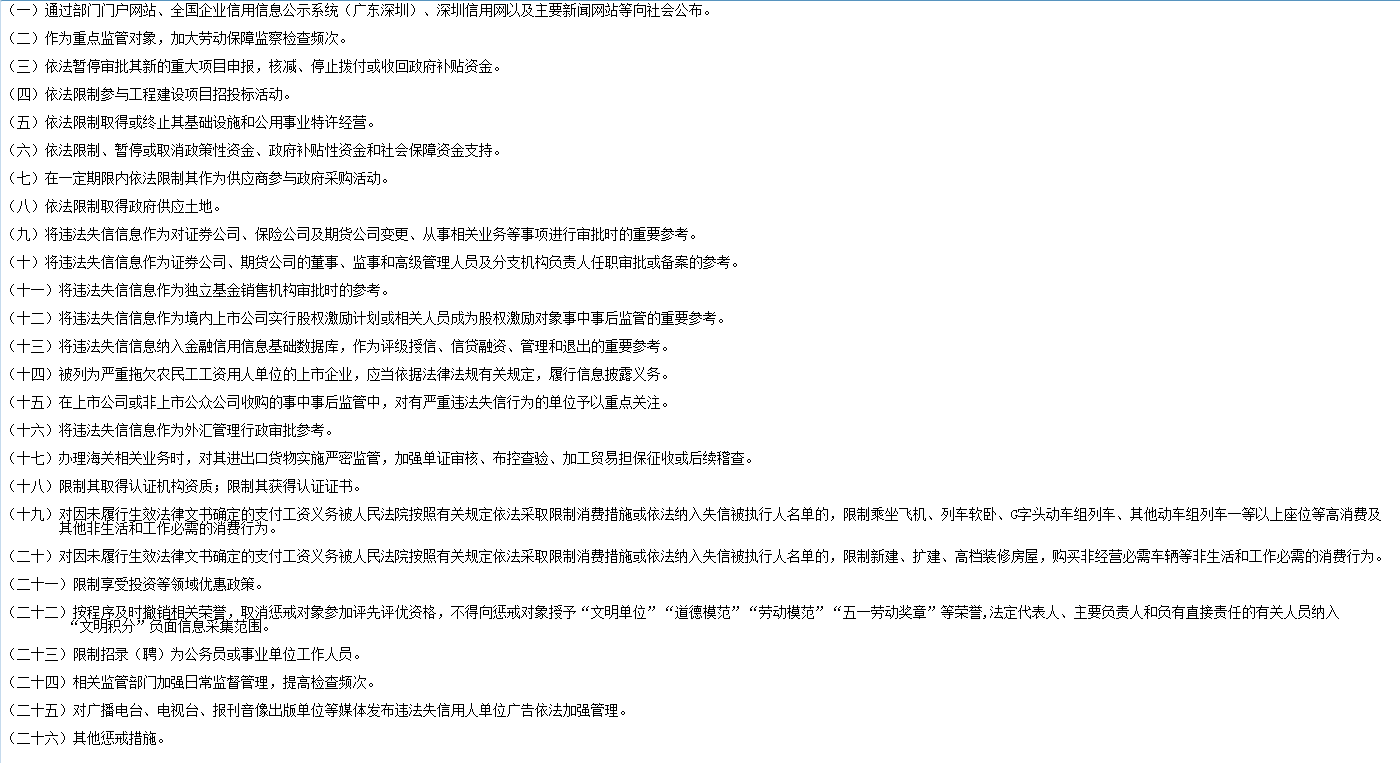 除此之外,深圳還實(shí)施了拖欠農(nóng)民工工資“黑名單”制度。用人單位出現(xiàn)克扣、無故拖欠一名勞動者三個月以上工資報(bào)酬,數(shù)額累計(jì)二萬元以上,且經(jīng)行政處罰(處理)的;克扣、無故拖欠十名以上勞動者的勞動報(bào)酬且數(shù)額累計(jì)在十萬元以上,且經(jīng)行政處罰(處理)的;涉嫌構(gòu)成拒不支付勞動報(bào)酬罪,案件被移送公安機(jī)關(guān),且公安機(jī)關(guān)受理立案的;因拖欠工資違法行為引發(fā)群體性事件、極端事件造成嚴(yán)重不良社會影響,且經(jīng)行政處罰(處理)的具體情況時(shí),會被列入黑名單。
