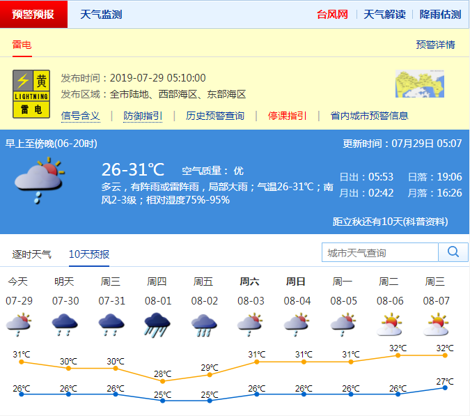 見圳客戶端·深圳新聞網(wǎng)2019年7月29日訊 今天多云有雷陣雨,局部大雨;26-31℃;南風(fēng)2-3級(jí);濕度75%-95%。預(yù)計(jì)30-31日陰天間多云,有雷陣雨,局部暴雨;8月1日-2日有一次暴雨降雨過程;8月3日-5日降雨減弱,多云有陣雨或雷陣雨。