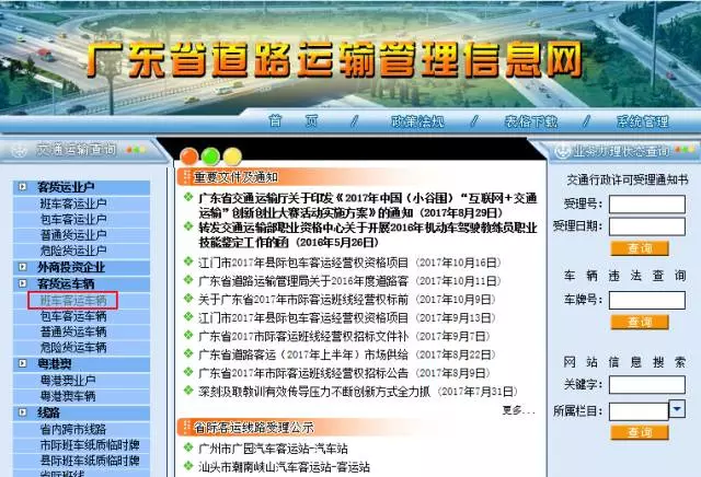 登錄廣東省道路運輸管理信息網(wǎng),點擊左側(cè)菜單欄中的「客貨運車輛」,再點擊「客班車客運車輛」,就能進入到查詢頁面。