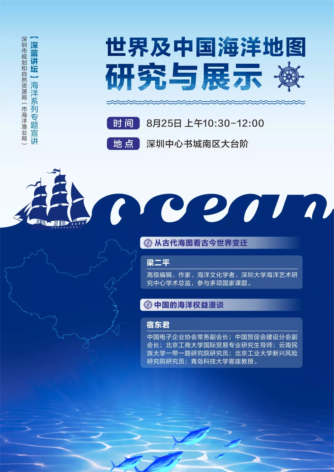 麥哲倫完成了第一次環(huán)球航行、哥倫布發(fā)現(xiàn)了新大陸、迪亞士最早探險至非洲最南端好望角、達(dá)伽馬開辟了通往印度的新航線…… 2000多年前,在茫茫大海上 裝備簡陋的航海者 取暖靠抖、通訊靠吼 沒有網(wǎng)絡(luò)、沒有手機(jī)、沒有GPS …… 卻能在廣闊無邊的大海中 找到心之所向的目的地 這是因?yàn)?/p> 他們有一張神奇的圖——海圖 梁二平:從古代海圖看古今世界變遷 世界上這一次又一次的航海大發(fā)現(xiàn),或者是由黃金、白銀、香料、瓷器、黑奴貿(mào)易等所引發(fā)的大侵略、大移民、大變革,都在一張小小的圖中展現(xiàn)得淋漓盡致。 大航海時代早期,西班牙、葡萄牙稱霸海洋,出盡了風(fēng)頭,靠的就是海圖。后來英國擊敗荷蘭,意識到光靠戰(zhàn)爭是控制不了海洋的,更重要的是海洋知識。于是,英國設(shè)立了一個水文部,專門進(jìn)行測量和制作海圖。這便是一代“海上霸主”崛起的關(guān)鍵。 每一幅海圖 都承載著豐富的地理、社會及歷史信息 不同時代、地域,不同文化背景下的海圖繪制者 對空間有著不同的理解 描繪世界的方式也有所不同 海圖一步一步從文字描述到精確標(biāo)注 東西方海圖相互交融發(fā)展 為海洋變遷提供了真實(shí)的見證 一張小小的海圖 卻扮演著舉足輕重的“角色” 其實(shí),它也和海洋權(quán)益 也有著密不可分的關(guān)系 宿東君:中國的海洋權(quán)益漫談 談及主權(quán)問題 我們總是滿懷著一腔熱血 看紀(jì)錄片時 海上時不時會漂浮著一個個小浮標(biāo) 想知道小浮標(biāo)對海洋科技考察有什么作用? 中國先驅(qū)又是如何歷盡艱難險阻 主張屬于中國的海洋權(quán)益的? 想知道引發(fā) 南海問題、釣魚島問題的“來龍去脈”嗎? 以上的種種疑問 都將在8月25日的“”深藍(lán)講壇” 一同為你揭曉! “深藍(lán)講壇” 2017年5月,《全國海洋經(jīng)濟(jì)發(fā)展“十三五”規(guī)劃》明確提出推進(jìn)深圳建設(shè)全球海洋中心城市,在投融資、服務(wù)貿(mào)易、商務(wù)旅游等方面進(jìn)一步提升對外開放水平和國際影響力,打造成為“21世紀(jì)海上絲綢之路”的排頭兵和主力軍;2018年9月,市委市政府印發(fā)《關(guān)于勇當(dāng)海洋強(qiáng)國尖兵加快建設(shè)全球海洋中心城市的決定》及實(shí)施方案;2019年,深圳創(chuàng)建全球海洋中心城市納入到《粵港澳大灣區(qū)規(guī)劃發(fā)展綱要》和《關(guān)于支持深圳建設(shè)中國特色社會主義先行示范區(qū)的意見》。 為讓社會了解這一重要政策,計(jì)劃通過開展“深藍(lán)講壇”專題系列活動,通過專家講授、市民互動等活動,請市民對我市海洋發(fā)展政策、主要目標(biāo)和實(shí)施路徑等建言獻(xiàn)策,在擴(kuò)大影響面的同時收集好的意見和建議,以更好地推動我市海洋各項(xiàng)工作的順利開展,為我市創(chuàng)建全球海洋中心城市營造氛圍,奠定思想基礎(chǔ)。 現(xiàn)在,“深藍(lán)講壇”專題系列活動真的來了! 8月25日 以“世界及中國海洋地圖研究與展示”為主題 2019年首場“深藍(lán)講壇”海洋系列專題宣講活動 即將拉開帷幕