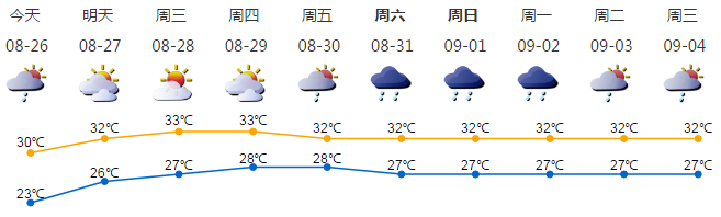 我市大雨轉(zhuǎn)陣雨;氣溫23-30℃;西南風(fēng)3級;相對濕度65%-95%。