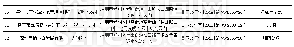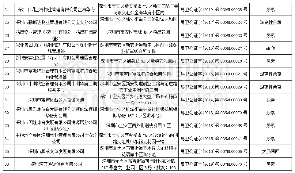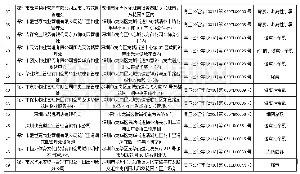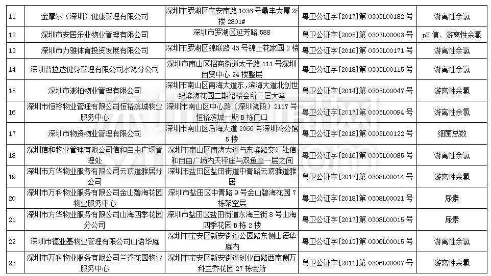 此次檢查結(jié)果顯示,深圳明門偉健體育服務(wù)有限公司(游泳池)、深圳市綠景物業(yè)管理有限公司城市立方花園管理處(游泳池)、深圳市盛世家物業(yè)管理有限公司花半里物業(yè)管理處(游泳池)尿素、游離性余氯兩項(xiàng)檢測指標(biāo)不合格,深圳市力美健華聯(lián)健身有限公司(游泳池)pH值、尿素兩項(xiàng)檢測指標(biāo)不合格,錦龍體育文化發(fā)展(深圳)有限公司(游泳池)、深圳市安居樂業(yè)物業(yè)管理有限公司(游泳池)、深圳市天健物業(yè)管理有限公司陽光天健城管理處(游泳池)pH值、游離性余氯兩項(xiàng)檢測指標(biāo)不合格,此外,有45家游泳場所分別因pH值、尿素、游離性余氯、細(xì)菌總數(shù)以及大腸菌群等指標(biāo)不合格被予以通告。衛(wèi)生監(jiān)督部門已責(zé)令抽檢結(jié)果不合格單位立即整改。