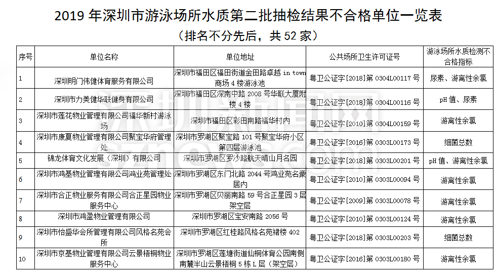 見圳客戶端·深圳新聞網(wǎng)2019年8月29日訊(見圳客戶端、深圳新聞網(wǎng)記者 劉夢婷 通訊員 深衛(wèi)監(jiān))深圳市衛(wèi)生健康委近期組織了各級衛(wèi)生監(jiān)督機(jī)構(gòu)對全市游泳場所水質(zhì)進(jìn)行了分批專項(xiàng)抽樣檢驗(yàn),并在近日公布了2019年第二批游泳場所水質(zhì)抽檢結(jié)果。第二批共抽檢游泳場所451家,檢測指標(biāo)為游離性余氯、渾濁度、尿素、pH值、細(xì)菌總數(shù)、大腸菌群等六項(xiàng)。抽檢的451家游泳場所中,合格399家,合格率為88.47%,不合格52家,不合格率為11.53%;不合格指標(biāo)主要為游離性余氯、尿素、細(xì)菌總數(shù)、pH值和大腸菌群。