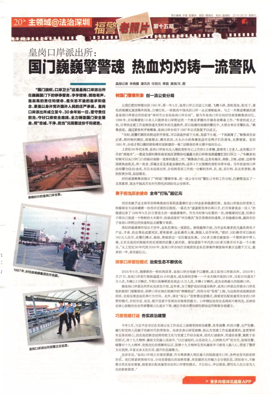 上世紀90年代末期,皇崗口岸每天出入境的貨柜車已上升到2萬多輛、旅客有1萬多人,還有數(shù)以千計的“兩地車”,一度成為那時期東南亞地區(qū)貨物吞吐量最大的口岸和亞洲最繁忙的口岸之一?!败囕v多的時候可以從口岸門口的福田南路一直排到蓮花二村?!辟圁敒I介紹,這里有海關(guān)、商檢、衛(wèi)檢、動檢、邊檢等國家執(zhí)法機關(guān),有一批省、部屬企業(yè)及多家金融機構(gòu),還有4個大規(guī)模的貨柜車停車場。當年的皇崗口岸分局警力僅60余名,并且未設(shè)派出所,分局將各項工作統(tǒng)一分解到各科、隊、室,實行科、隊長負責制,做到權(quán)責分明,層層落實。