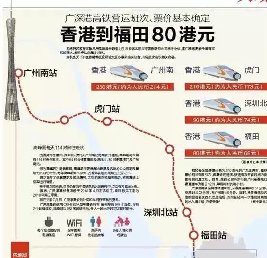 廣深港高鐵香港段,從香港西九龍總站發(fā)車,到深圳福田站、深圳北站、虎門站和廣州南站票價基本確定為80港元、90港元、210港元和260港元。