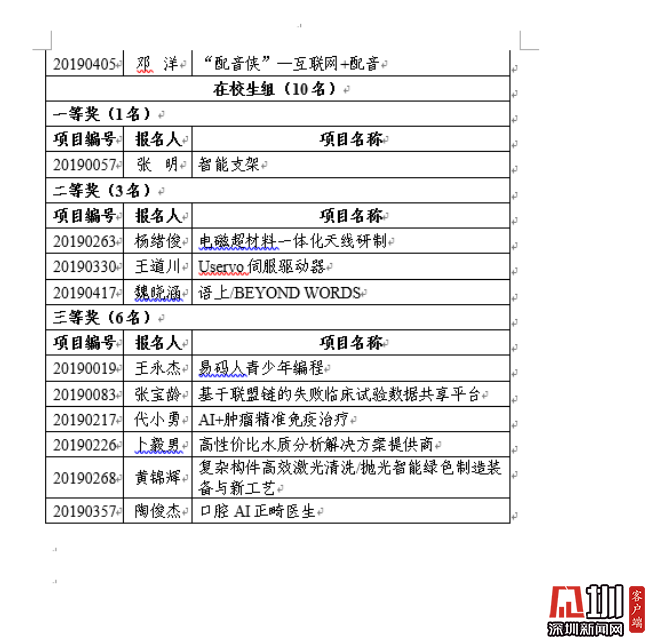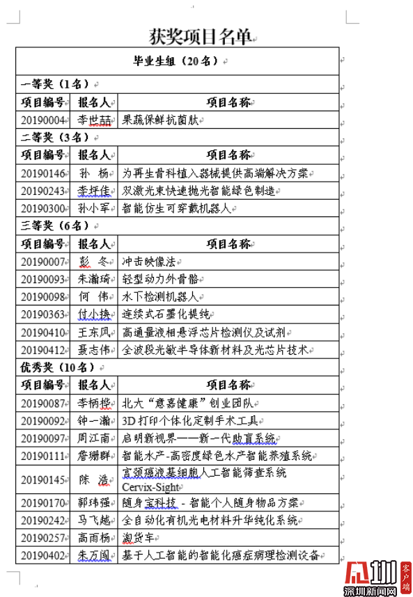 據(jù)了解,2019深圳“逐夢(mèng)杯”大學(xué)生創(chuàng)新創(chuàng)業(yè)大賽由市人力資源保障局、市教育局、團(tuán)市委共同主辦,深圳大學(xué)等15所高校協(xié)辦,市公共就業(yè)服務(wù)中心承辦。大賽自2016年開始,每年舉辦一屆,今年是第四屆。本屆大賽延續(xù)“逐夢(mèng)青春創(chuàng)贏未來”的主題,也是首次將港澳籍青年創(chuàng)業(yè)者納入?yún)①惙秶?。大賽于今?月正式啟動(dòng),共有397個(gè)項(xiàng)目報(bào)名參賽,參賽項(xiàng)目歷經(jīng)資格初審、初賽、復(fù)賽、決賽,最終30個(gè)優(yōu)秀創(chuàng)業(yè)項(xiàng)目脫穎而出,贏得大獎(jiǎng)。其中,“果蔬保鮮抗菌肽”項(xiàng)目獲畢業(yè)組一等獎(jiǎng),“智能仿生可穿戴機(jī)器人”等3個(gè)項(xiàng)目獲畢業(yè)組二等獎(jiǎng),“沖擊映像法”等6個(gè)項(xiàng)目獲畢業(yè)組三等獎(jiǎng),“北大‘意嘉健康’創(chuàng)業(yè)團(tuán)隊(duì)”等10個(gè)項(xiàng)目獲畢業(yè)組優(yōu)秀獎(jiǎng);“智能支架”項(xiàng)目獲在校生組一等獎(jiǎng),“Uservo伺服驅(qū)動(dòng)器”等3個(gè)項(xiàng)目獲在校生組二等獎(jiǎng),“易碼人青少年編程”等6個(gè)項(xiàng)目獲在校生組三等獎(jiǎng)。