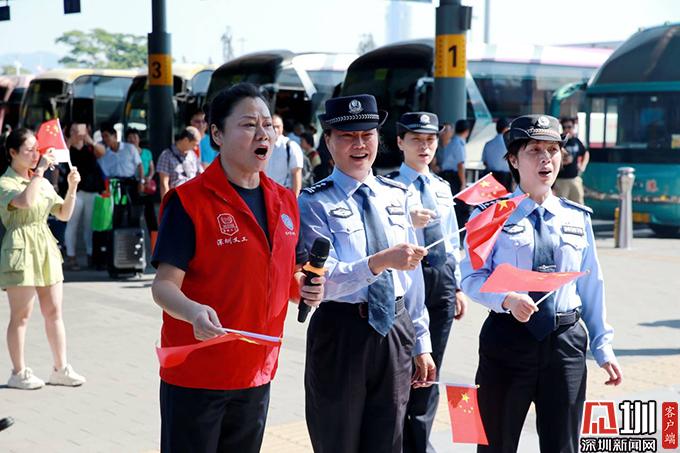 此時(shí),一首熟悉的《我和我的祖國(guó)》在人群中突然響起,引得周邊旅客紛紛駐足觀望。原來,深圳灣邊檢站民警為慶祝新中國(guó)成立70周年精心準(zhǔn)備的快閃節(jié)目此刻上演。隨后《我愛你中國(guó)》、《紅旗飄飄》依次唱響,現(xiàn)場(chǎng)的旅客逐漸圍攏過來,有和著旋律揮動(dòng)著國(guó)旗的,有拿起手機(jī)記錄下這激動(dòng)時(shí)刻的,現(xiàn)場(chǎng)變成一片紅色的海洋。其中一位年近七旬的李大爺激動(dòng)地說“聽到這旋律、看到五星紅旗心中就非常激動(dòng)。我是一名老兵,我為我們的祖國(guó)感到驕傲自豪”,說話間,老人眼中泛起了淚花??扉W表演結(jié)束后,大批旅客還不愿離去,大家紛紛舉起手機(jī),拿起國(guó)旗,拍下此刻最美的自拍,向祖國(guó)獻(xiàn)上最真摯的祝福:祝愿祖國(guó)明天更美好!