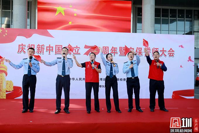 大會(huì)現(xiàn)場(chǎng),一面巨幅國(guó)旗在12名邊檢民警的護(hù)衛(wèi)下,在會(huì)場(chǎng)正中位置迎風(fēng)拂動(dòng);國(guó)旗兩側(cè),由深圳灣邊檢站民警、地方公安民警、駐地武警官兵、口岸輔警及口岸U站志愿者組成的方陣依次排列。